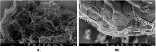 SEM images of PS fragments, before and after 24 h of UV light irradiation, showed only very low morphological degradation and no severe surface changes (Figure 1). The fragments were mainly >200 μm in size and had lateral dimensions that varied from tens to hundreds of micrometers, rather than discrete spherical or regular particles. In terms of morphology, pristine PS fragments (Figure 1a) showed a sheet-like, lamellar structure characterized by extensive wrinkling, folding, and crumpling. The sheets were not flat but densely bunched, forming a complex three-dimensional topography with pronounced ridges, folds, and crevices. Bright or semi-transparent edges indicated regions where the polymer thickness was extremely low, consistent with foamed PS. After UV irradiation (Figure 1b), no significant fragmentation or erosion was observed; the PS sheets appeared more compact with some small flakes and less translucent, suggesting a partial compression and densification of the lamellar structure. EDX analysis of PS fragments exhibited the presence of only C and O elements (Figures S1 and S2) from the PS polymer structure.