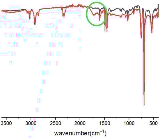 The signal around 1700 cm−1 was observed even when the PS was irradiated in the presence of the metal oxides, more evident with ZnO (Figure 3). The observed mitigation of a low-wavenumber band after UV irradiation (Figure 3, in the range 500–600 cm−1) points to a modification and/or a reduction of the Cu2O and ZnO species [52,53]. No significant –OH stretching was observed in all samples above 3000 cm−1, indicating that, in our conditions, the photooxidation mainly led to carbonyl functionalities rather than to a large accumulation of hydroxyl groups.