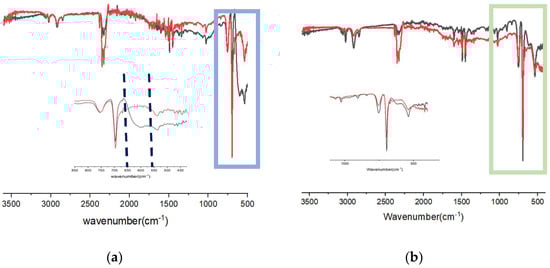 IR spectra of PS stirred in water with Cu2O (a) or ZnO (b): (black) before the irradiation; (red) after UV irradiation (24 h).