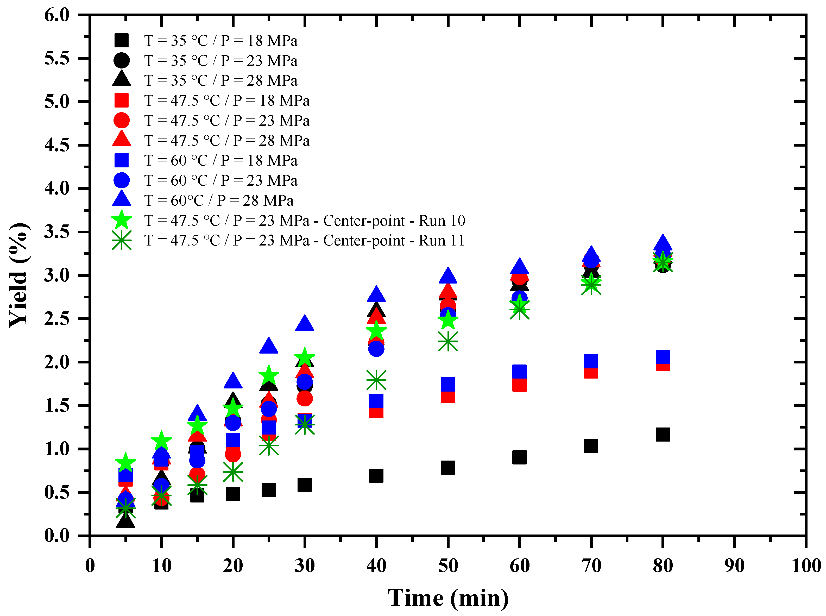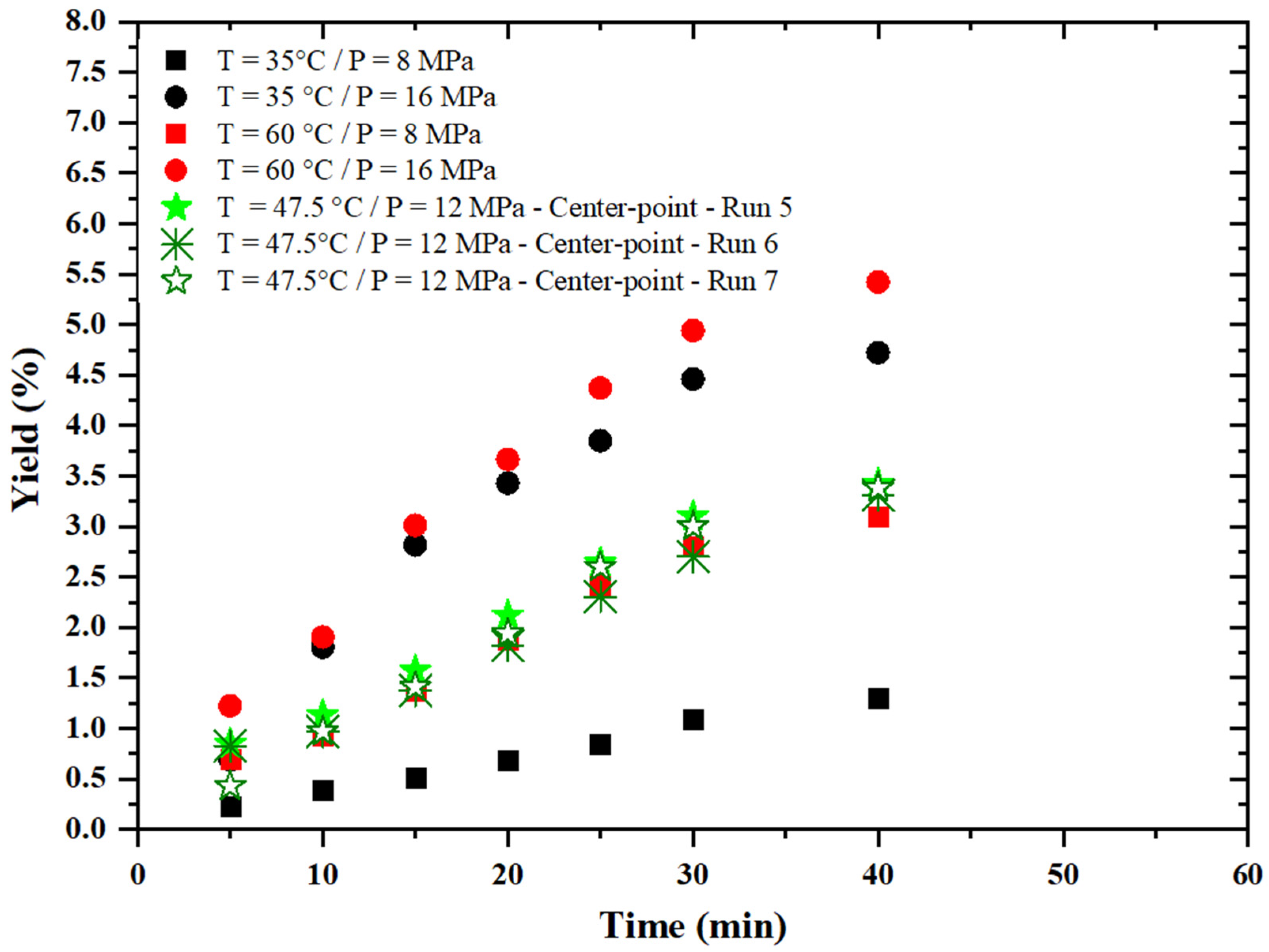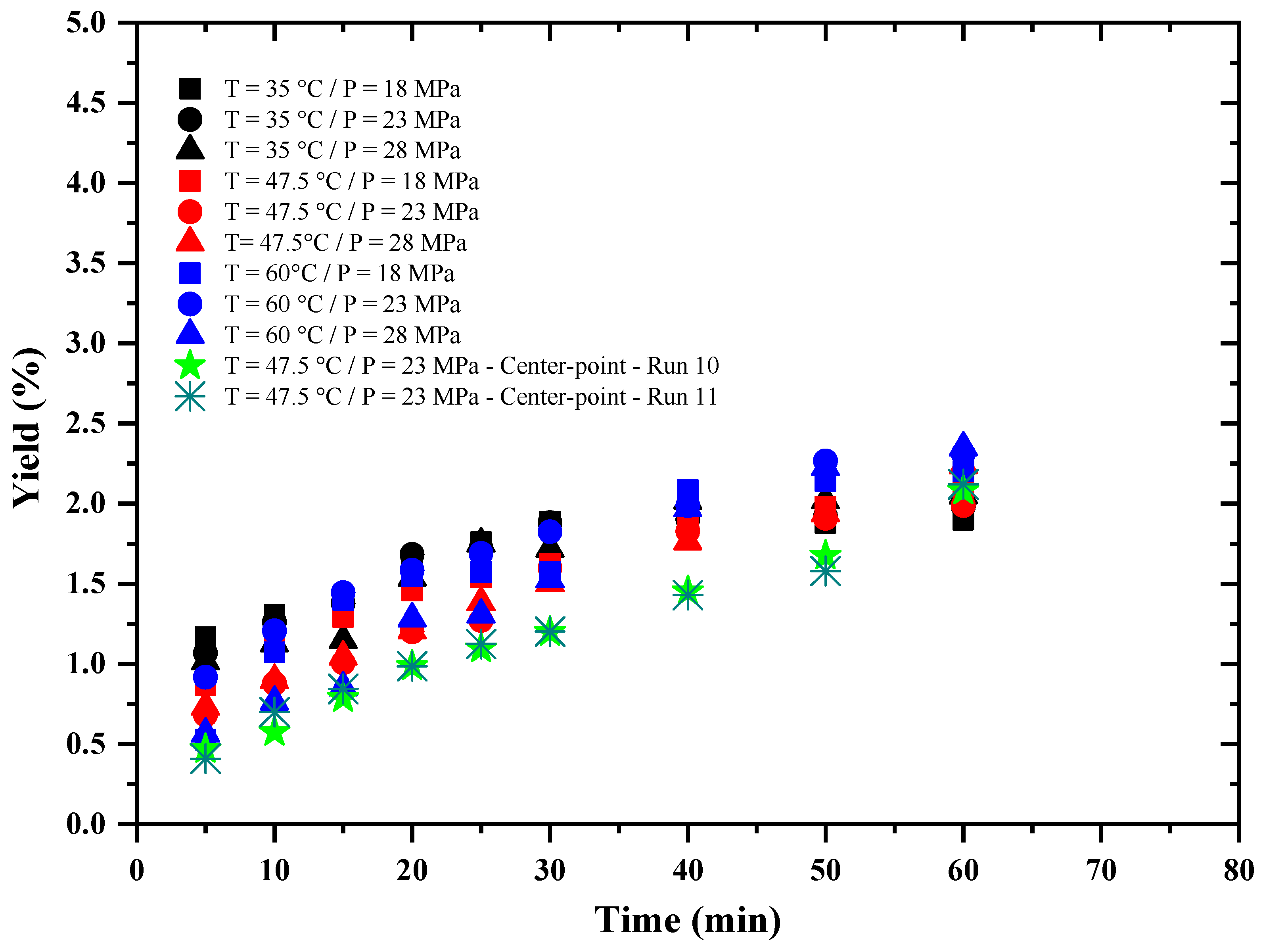Table 7). The highest yields (up to 5.42% at 60 °C and 16 MPa) and fastest plateau times (~30–35 min) were observed under these conditions. Higher pressure combined with elevated temperature consistently increased the yield within the 2