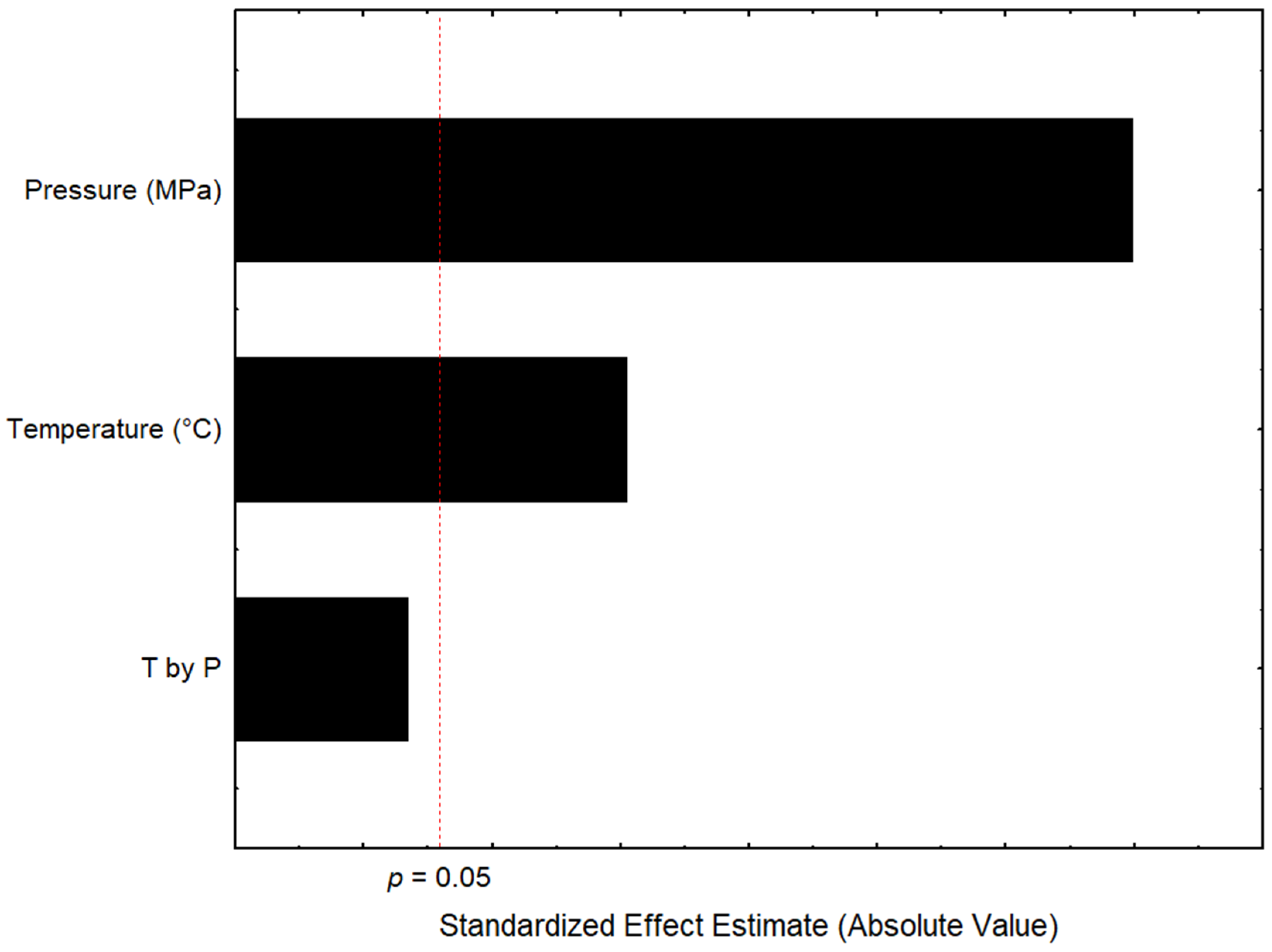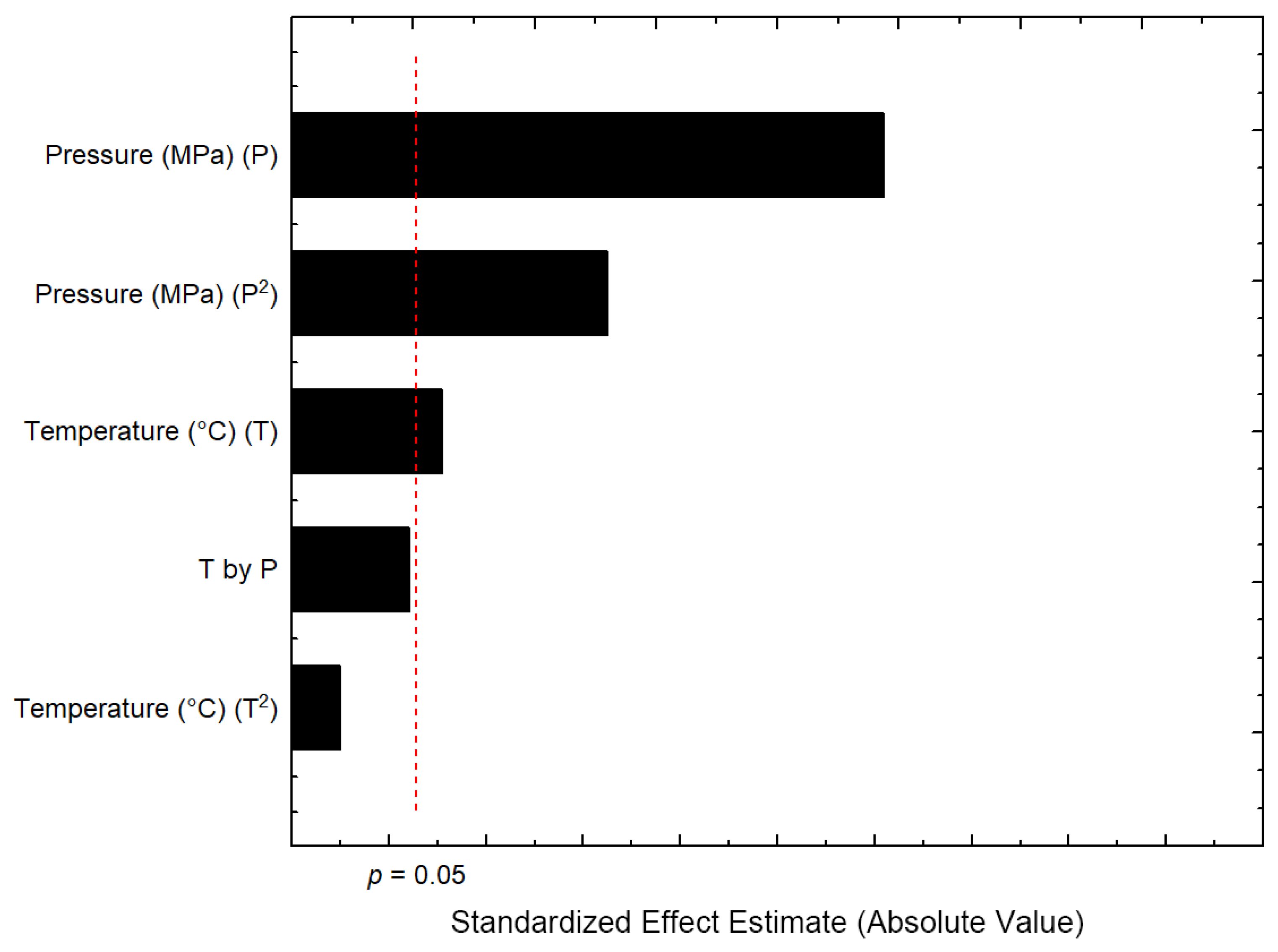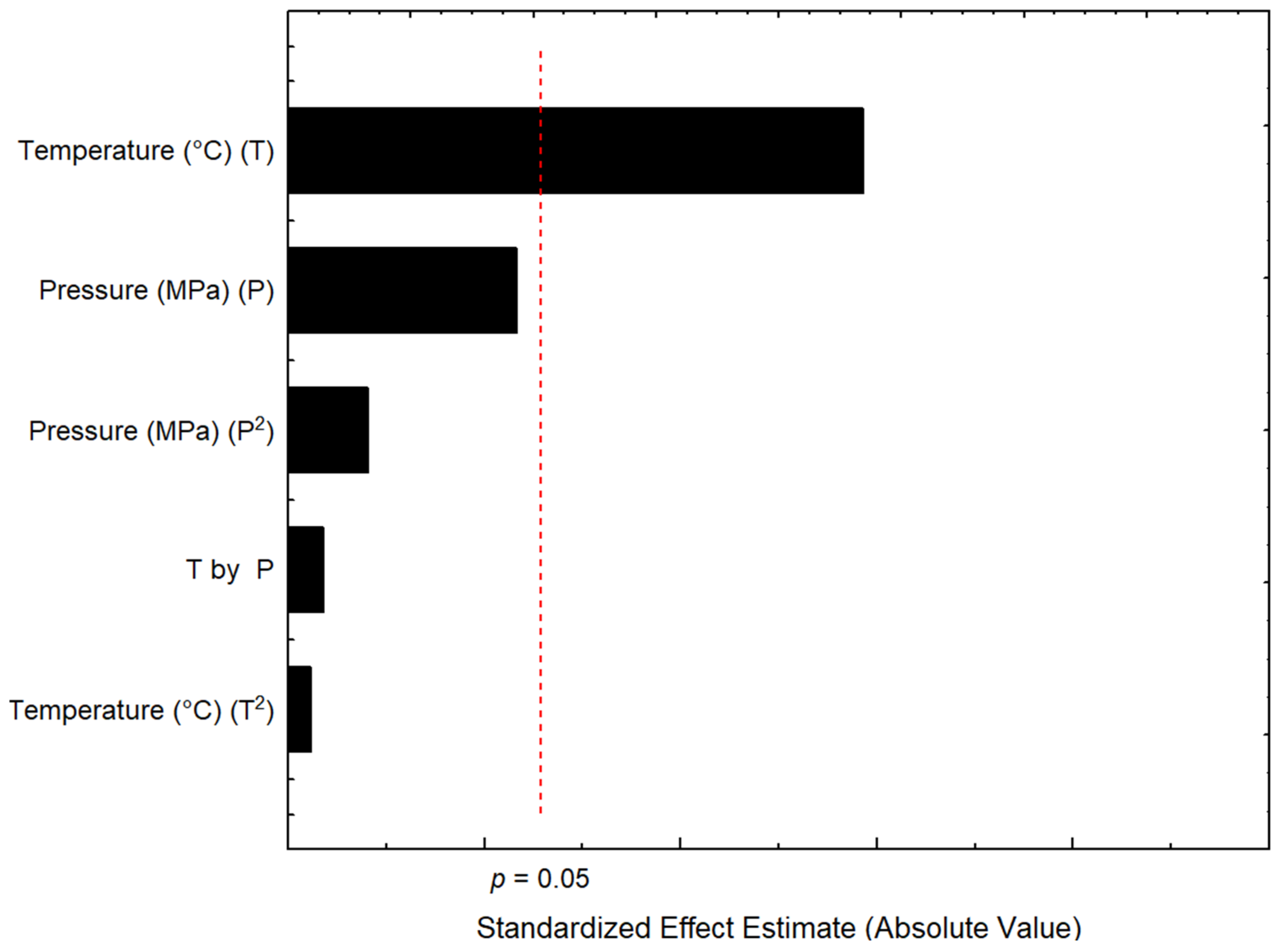 39]. The quadratic model (Equation (1)) accounted for nearly 98% of the variance in the yield data, and ANOVA results highlighted pressure as the primary driver with a relevant temperature influence and relevant interaction effect (