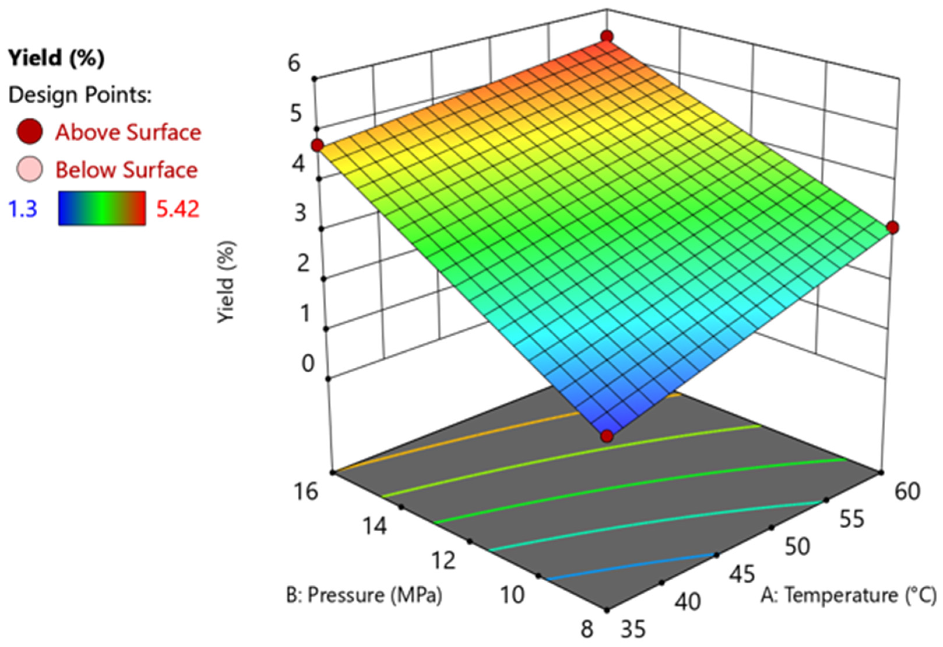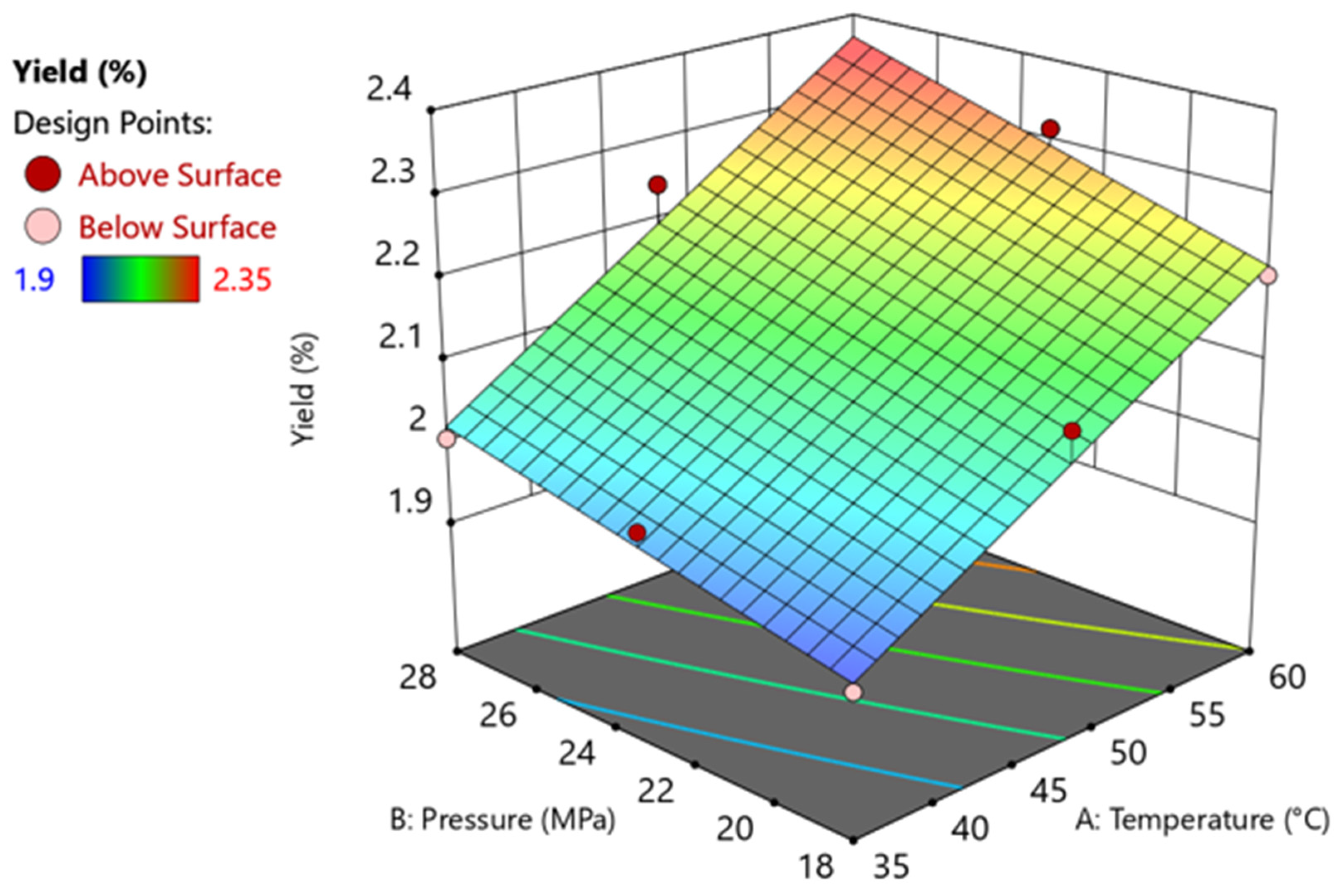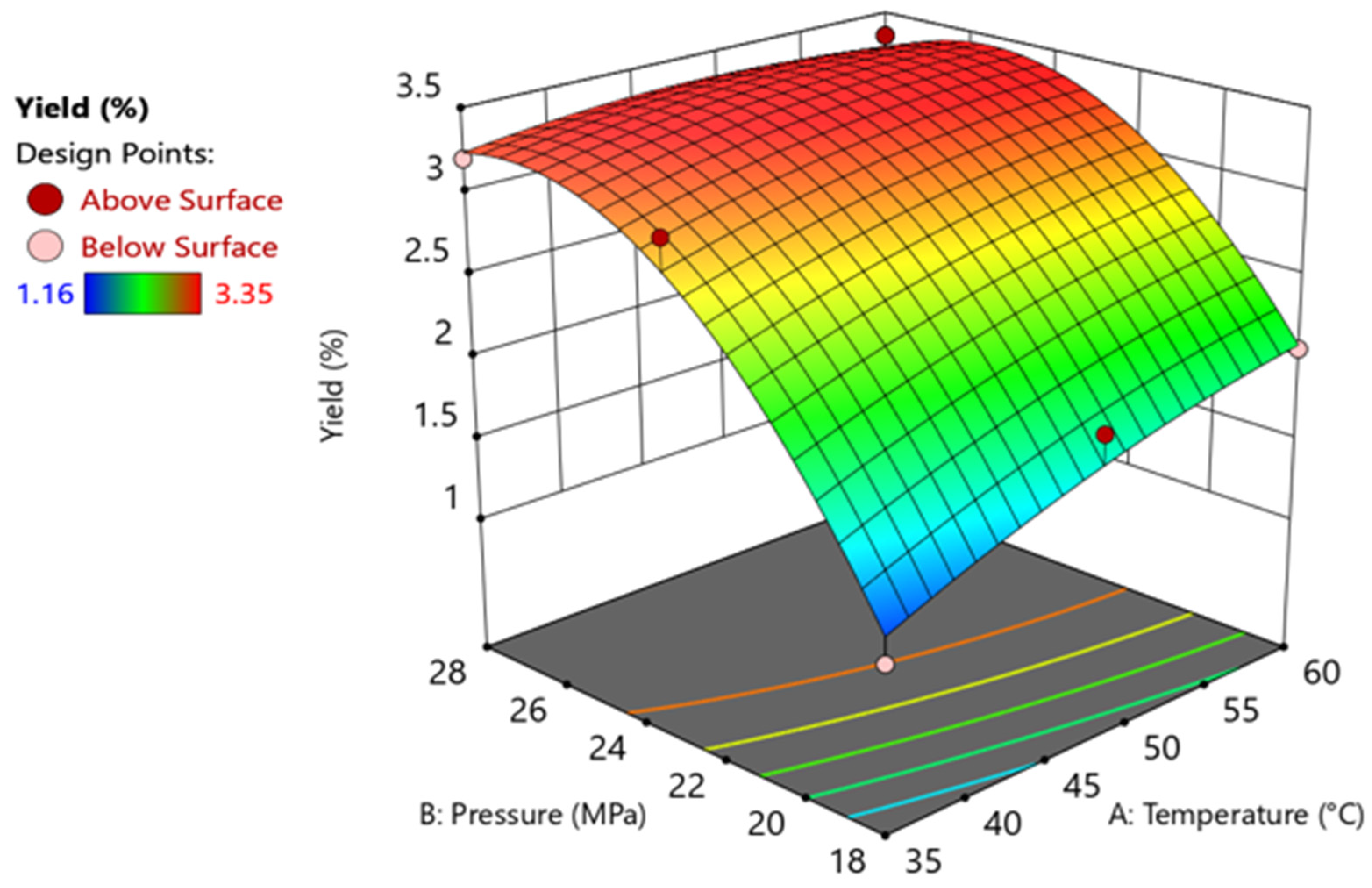 Figure 4) reveals the characteristic curvature of a quadratic model, with yield maximization occurring at high pressure and intermediate temperature, which is typical behavior for supercritical CO
