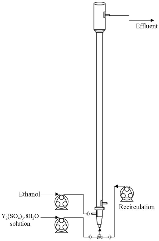 All experiments were conducted at ambient laboratory temperature (23 °C) and done in triplicate with error bars in figures indicating standard error. The start-up process involved simultaneously starting the feeds of the aqueous yttrium sulfate solution and ethanol at their respective rates to achieve the intended O/A ratio as outlined in Table 2, followed by suspending the inlet flows once the FBR and recirculating sections were filled to initiate recirculation. For the initial investigations, the seeds were loaded onto the glass beads before initiation of the experiments.