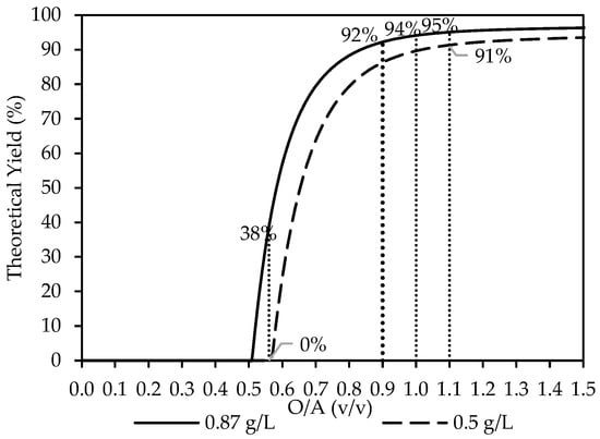 The theoretical yield of Y3+ as the O/A ratio increases from a starting concentration of 0.87 g/L Y3+ (―) and 0.5 g/L Y3+ (---). The dotted lines, serving as visual guides, indicate the O/A ratios investigated in this study, with Y2(SO4)3·8H2O predicted as the stable solid phase.