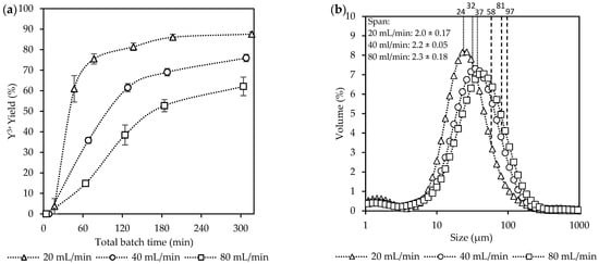 The CSDs curves for the final product in Figure 4b shifted towards larger sizes as the inlet flow rate increased. The D50 at 20 mL/min was 24 µm, 40 mL/min with 28 µm, and 80 mL/min with 34 µm. The D90 at 20 mL/min was 58 µm, 40 mL/min with 71 µm, and 80 mL/min with 85 µm. The span remained similar for all the flow rates at ~2.