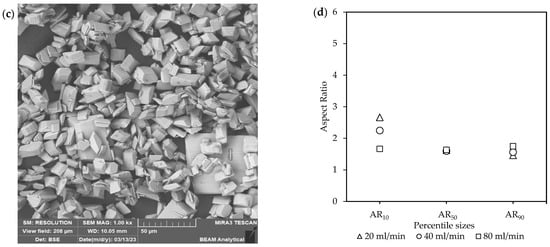 In Figure 4c,d and Figure S3, the crystal characteristics at the end of the feeding times, with 20 mL/min for 16 min, 40 mL/min for 8 min, and 80 mL/min for 4 min. The existence of a few amorphous agglomerated particles among the well-defined crystals was also observed at 80 mL/min, as shown in Figure S3d,e. The crystals at the beginning of crystallization in Figure 4c are prismatic rods with matching large ARs. The slowest total inlet flow rate of 20 mL/min resulted in more elongated crystals, with AR10 = 6, compared to 40 mL/min and 80 mL/min at AR10 = ~3.3. Whereas the larger crystals at AR90 were very similar.