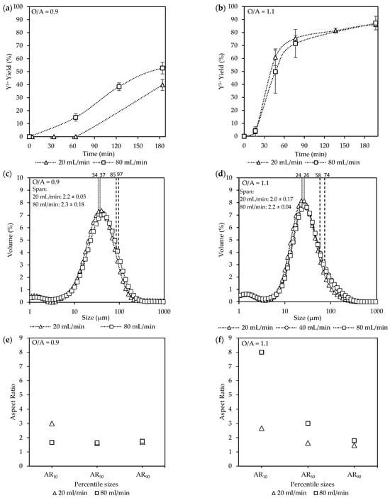 In contrast, at O/A = 1.1 in Figure 5b, the yields increased more rapidly, reaching a maximum of 87%, with no significant difference between recirculation rates. The onset of crystallization took place within the feeding time, as a 4% yield had already taken place by the end of filling, where 60 min later, it had rapidly increased to ±73%. The D50 values in Figure 5d averaged around 25 µm for all flow rates. A similar slight broadening of the D90 values, from 58 µm to 74 µm, was observed compared to the O/A = 0.9 conditions. Furthermore, the crystal sizes were smaller for the O/A = 1.1 experiments compared to the O/A = 0.9 experiments for both the D10 and D50 values. However, no significant difference in the span (~2) was observed for both sets of experiments.