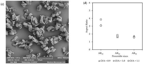 Figure 6c,d, accompanied by Figure S6, illustrates SEM images along with the corresponding aspect ratios. A variety of different shapes and sizes were observed, with intergrowth and agglomeration being common. In terms of the ARs, the most notable difference was observed at AR10, where O/A = 1.1 resulted in longer crystals (AR = 4) compared to the lower O/A ratios (AR = ~3). However, the aspect ratios of the larger crystals (AR50 and AR90) were similar. Furthermore, although much faster crystallization kinetics were observed at the higher O/A ratio, the resulting crystals did not show any reduction in product quality, such as a large decrease in crystal size or a change in morphology to needles or plates.