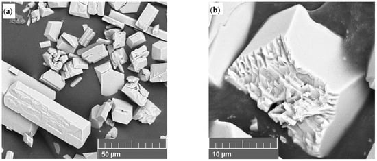 The progression of growth on the crystal faces was observed at 30 min, as shown in Figure 7. The growth predominantly seemed to follow an ordered pattern, eventually leading to the formation of smooth faces. The presence of discernible growth layers at this intermediate stage suggests a relatively low driving force, which slowed the crystallization process enough for such features to be captured. In some instances, individual crystals underwent intergrowth or twinning. This led either to the formation of larger, well-defined single crystals or to agglomerates where the distinct morphology of the primary crystallites remained visible. Such outcomes are likely driven by interfacial energies that favor the combination and agglomeration of collided crystals, which further grow as a single entity [35].