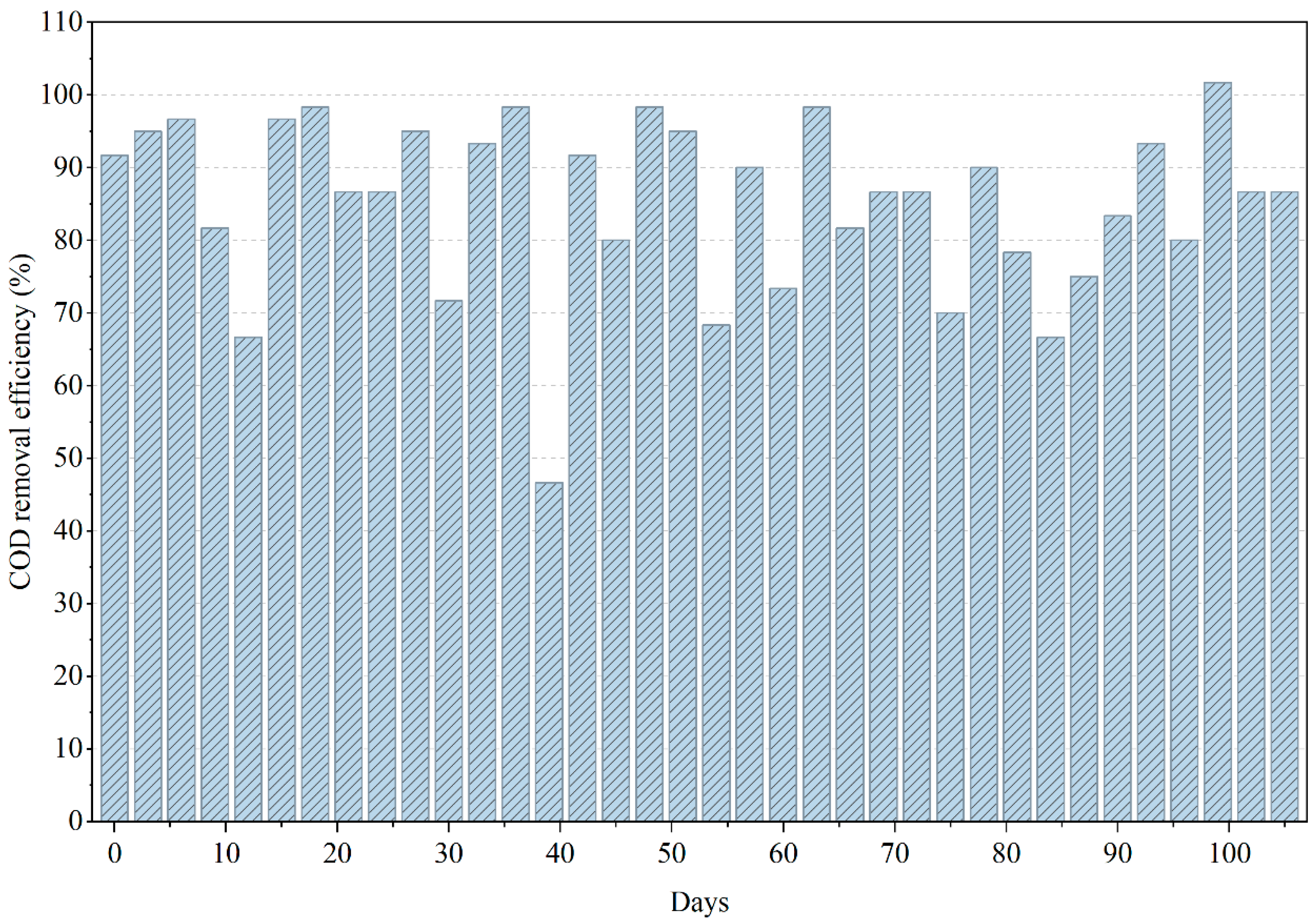 Figure 3. Variations in COD removal efficiency during the anaerobic treatment of PWW2.