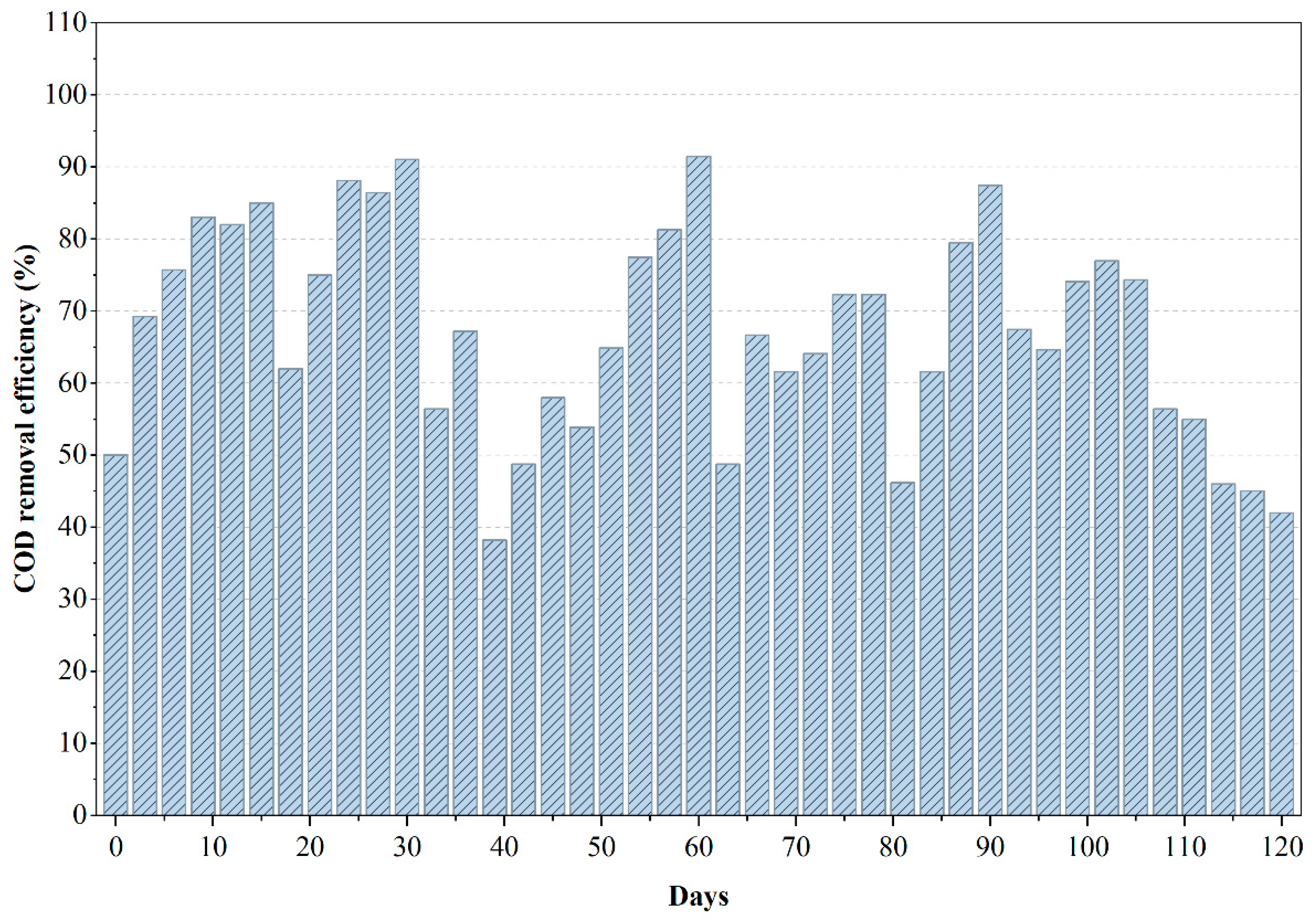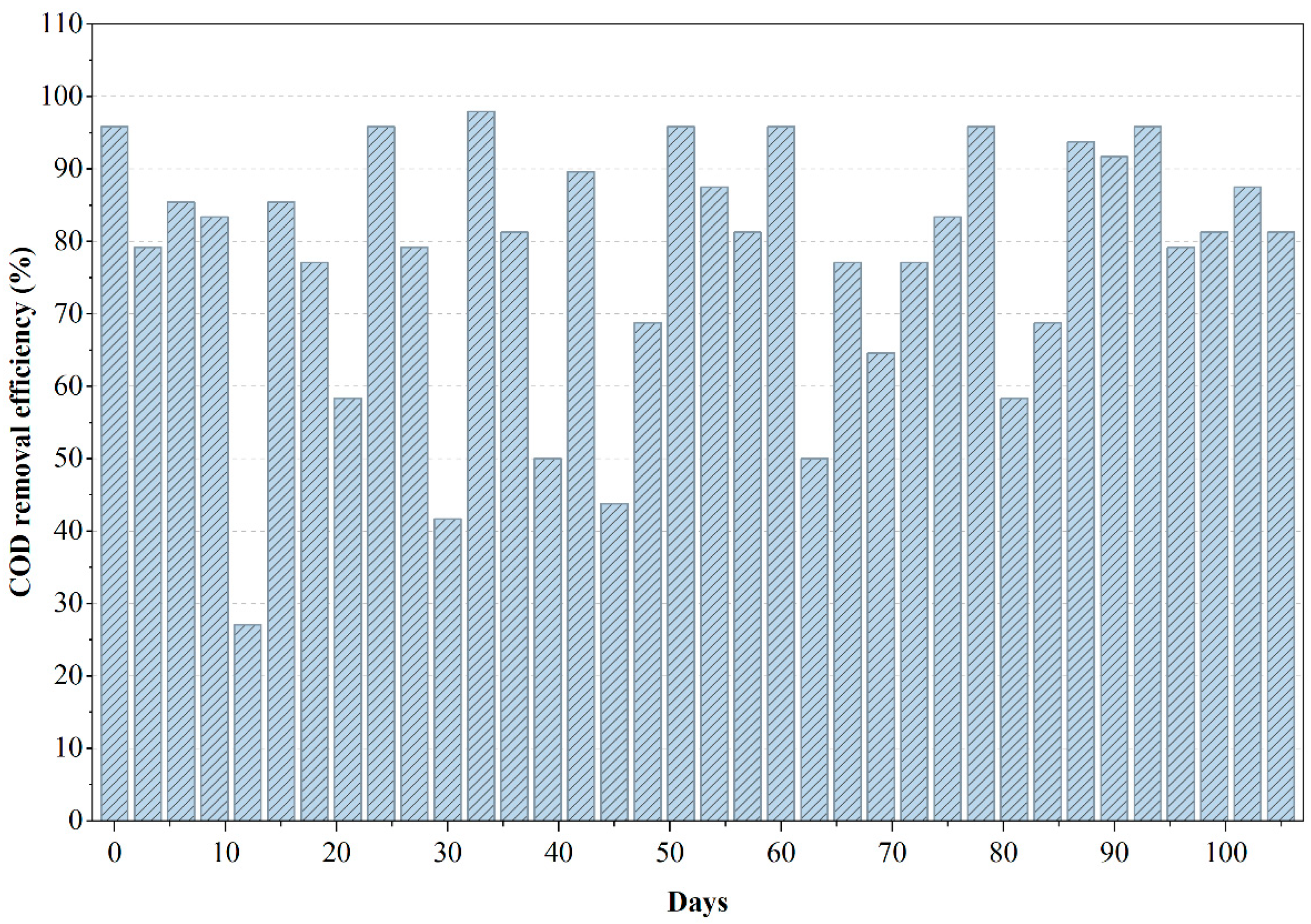 Figure 4. Variations in COD removal efficiency during the anaerobic treatment of PWW3.