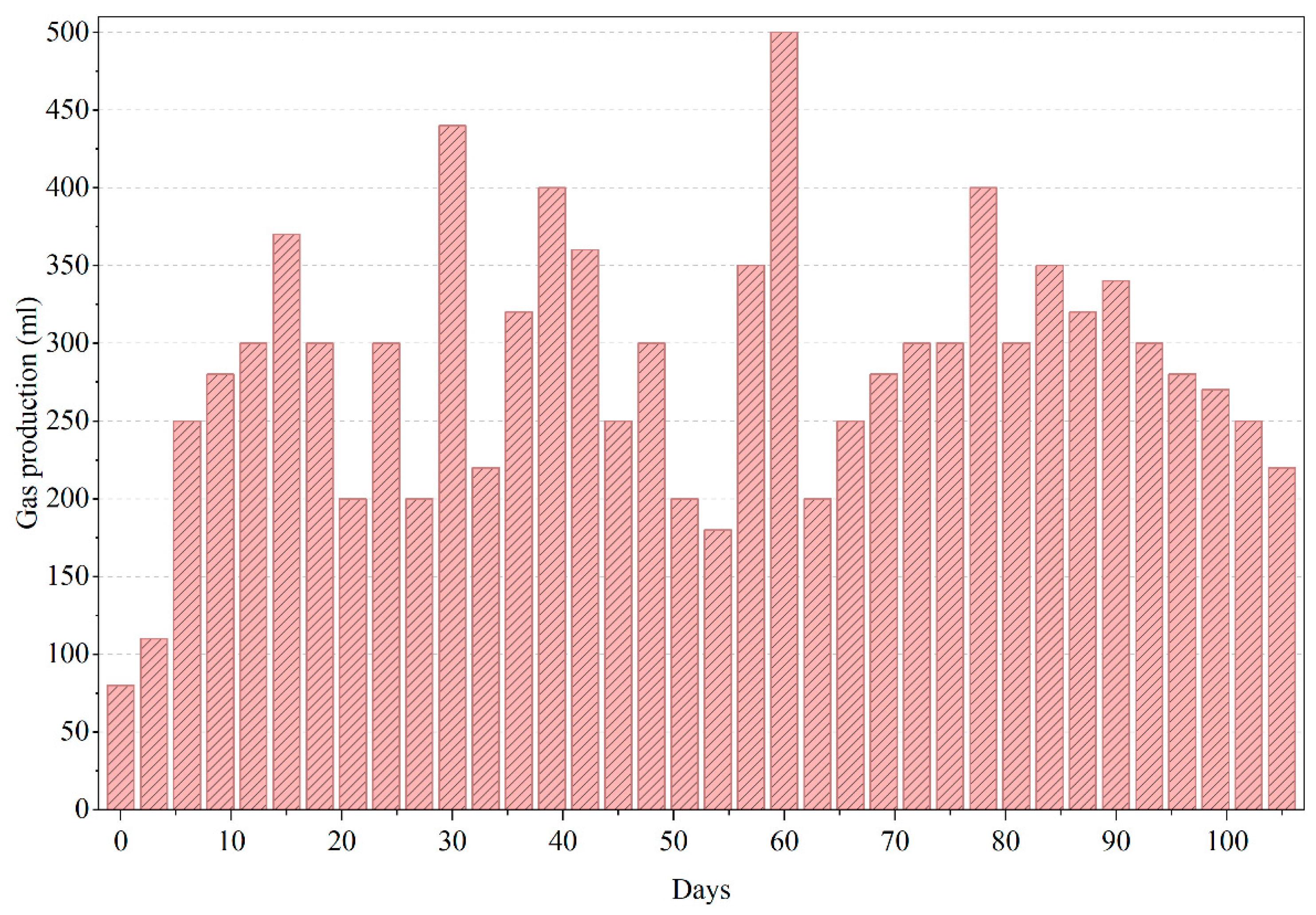 Beyond day 60, the reactor exhibited noticeable fluctuations in COD removal, suggesting transient inhibition events or accumulation of intermediate volatile fatty acids (VFAs). These instabilities are characteristic of anaerobic degradation of paint wastewater, where certain constituents such as phthalates, glycol ether derivatives, and high-molecular-weight additives—exert inhibitory pressure on methanogens when present at elevated concentrations or when biodegradation intermediates accumulate. The slight decline in removal efficiency observed toward the end of the operational period implies that inhibitory metabolites or recalcitrant compounds may have begun to accumulate faster than they were degraded. Such behavior aligns with reported literature on paint effluents, where persistent aromatic compounds slow methanogenesis, occasionally shifting biogas composition toward higher CO2 fractions.