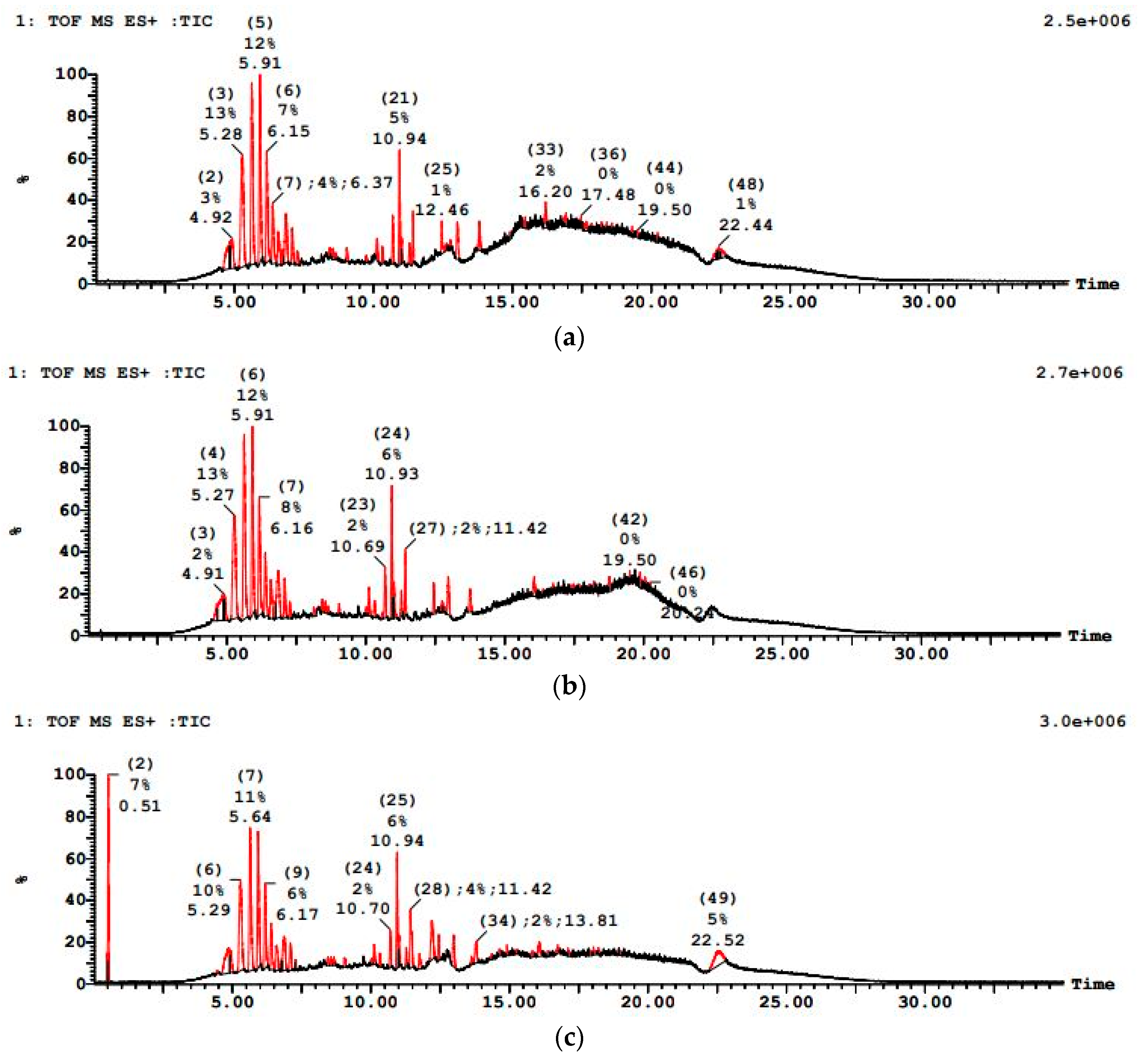 Figure 12. LCMS graph showing paint wastewater PWW2 (a) before treatment, (b) after anaerobic treatment, and (c) after aerobic treatment.