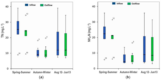 The quality of discharged wastewater was also unstable in time for all N compounds, which was confirmed by very high coefficients of variation (CV) with values above 43.8% (warm period), 55.7% (cold period), and 64.7% (whole period) for TN, and 49.4% (warm period), 84.8% (cold period), and 84.7% for NH4+-N (whole period). The same trend was observed for NOx-N and Org-N, although the CV was lower and ranged from 31% to 37%. These results seem indicated that variability observed in the inflow concentrations was not significantly reduced in outflow, even though, in spring–summer period, lower variability in effluent quality was observed when compared with autumn–winter period (Figure 1).
