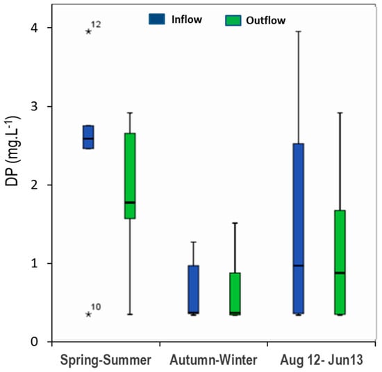 Thus, the results allow us to conclude that there were significant differences (p < 0.05) in the rate of removal of TP and DP between two seasonal periods considered, with highest percentage removal occurring in warmest period. The results showed that there was a sharp decrease of 14.6% in the removal efficiency of TP from spring–summer to autumn–winter, whereas, regarding DP, this reduction was 26.1% (Figure 5). This figure also shows that there was a trend toward greater instability in the efficiency of removal of both the TP and DP during the autumn–winter.