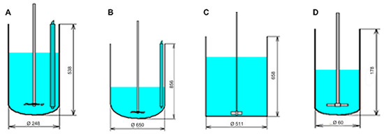 Four different reaction vessels used in the simulation. (A) Reaction vessel contains disk turbine with six blades. Diameter of the reactor is 248 mm and height is 538 mm, the disk tip diameter is 100 mm and blade length of 20 mm. the disk is located 63 mm above the bottom and rotation frequency is 45 RPM. (B) Reaction vessel contains disk turbine with six blades. Diameter of the reactor is 650 mm and height is 856 mm, the disk tip diameter is 175 mm and blade length of 45 mm. the disk is located 75 mm above the bottom and rotation frequency is 45 RPM. (C) Flat bottom reaction vessel contains paddle with two blades. Diameter of the reactor is 511 mm and height is 658 mm, the tip diameter is 102 mm. the paddle is located 25.5 mm above the bottom and rotation frequency is 200 RPM. (D) Reaction vessel contains paddle with 2 blades. Diameter of the reactor is 60 mm and height is 178 mm, the tip diameter is 30 mm and blade length of 45 mm. the paddle is located 20 mm above the bottom and rotation frequency is 500 RPM.