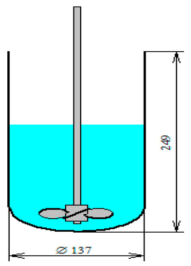 Reaction vessel which contains one propeller type impeller. Diameter of the reactor is 137 mm and height is 249 mm, the impellers contain three blades the tip diameter is 76.2 mm. The impeller is located 25.5 mm above the bottom and rotation frequency is 200 rpm.