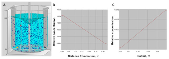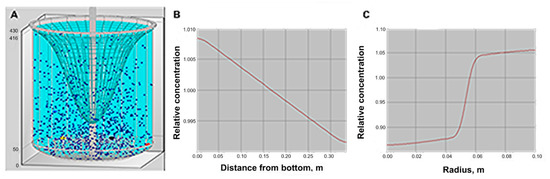 Simulation for solid distribution in a reactor. (A) is the visualization of the particle distribution and the vortex, (B) is the axial distribution of the solid phase, and (C) is the radial distribution of the solid phase.