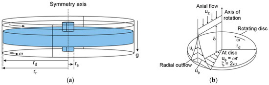 The flow in the reactor wheelspace or cavity is characterized by an axis-symmetrical forced-vortex Batchelor flow with separated boundary layers at the rotor and the stator. The velocity profile of the flow on the disc boundary layer is illustrated in Figure 1b with radial, tangential, and axial velocity flow profiles. The circumferential velocity in a forced vortex flow increases radially outwards with the radius attaining a maximum at the tip of the disc (tip velocity), while the vorticity magnitude is nearly constant with its amplitude twice the angular velocity of the rotating disc. The flow in the reactor system on the boundary layers may be characterized by a certain degree of flow instability when it is above the critical Reynolds number Reϕ, critical ≈ 2 × 105 with small patches of turbulence or oscillating vortex disturbance [7,8]. This can be expressed mathematically for the boundary layer near the rotor using the local rotational Reynolds number Reϕ, local (Equation (1)). The gap ratio G of the reactor is defined as the ratio of the wheelspace width to the outer disc radius, and is approximately 0.2206 for this reactor system (Equation (2)). The theoretical hydrodynamic characteristic values are given in Table 1.