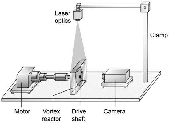 The flow measurement commences after running the reactor for a period of time in which the fluid flow had reached a steady state. In our case, we assume a time longer than t = tGϕ = 25 as the time at which the system has reached a pseudo-steady state condition [27]. The 2-D PIV measurements, which are described in detail elsewhere [15], consist of an RVR reactor system seeded with tracing particles and distilled water at standard conditions as a working fluid (Figure 2). The geometry of the reactor presented some measurement constraints, which was taken into account in the post-processing and analysis of the experimental data. The laser system for the experimental measurements consist of a LINOS Nano 259-532-100 (Qioptic GmbH & Co. KG, Munich, Germany) providing illumination for a cross section of the reactor under investigation. A high-resolution complementary metal-oxide semiconductor (CMOS) camera was used to capture the steady state fluid flow behaviour for post-processing and cross-correlation in MATLAB R2015a (Mathworks GmbH, Germany). The seeding particles is a mixture (1:1) of silver-coated and hollow glass spheres (Dantec Dynamics, A/S, Denmark) measuring 10 μm in average diameter with a good light scattering efficiency and sufficiently small velocity lag [28,29].