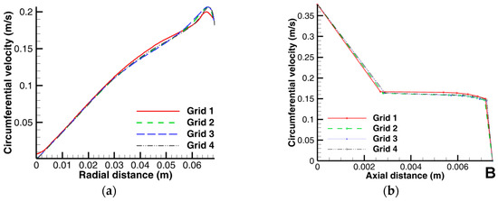 A solid modelling software (ANSYS DesignModeler 18.2, ANSYS Inc.) was used to create the simplified CAD model of the reactor along with the rotating disc to describe the fluid domain (Figure 3). Thereafter, a computational mesh was generated from the solid model for the computational study which consisted of structured hexahedral mesh using the commercial grid generation software ANSYS Meshing 18.2 (ANSYS Inc.). Four grids of different mesh densities of approximately 0.042 × 106, 0.431 × 106, 0.86 × 106, and 1.3 × 106 elements were created for the grid independence study. The grid independence study was conducted by carrying out the numerical simulation on successively finer grids. Thereafter, the results of the circumferential velocities were compared for all the grids to establish that they are grid-independent. Finally, a mesh containing approximately half a million elements was thereafter chosen on the basis of a trade-off between the required computational accuracy and CPU time needed to run the simulation to a converged solution. This optimized mesh was thereafter used for subsequent computations of all parameters of interest with a computation time of approximately 15 h for the highest operating speed. Figure 4 shows the radial and axial circumferential velocity profiles along the Y-Z and X-Z planes at x = 0.003725 and y = 0.045, respectively, for a rotation speed of 70 rpm for all the four grids employed for the convergence study and clearly demonstrates that the results are grid-independent.