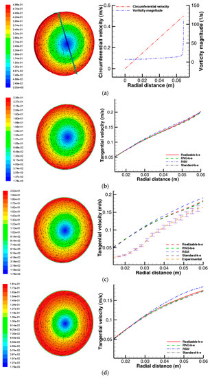 The basic outline of the flow pattern was also consistent with the PIV results, which are available elsewhere [15]. The velocity profiles at two selected Y-Z cross sections on the model were validated by comparing them with the PIV experimental data obtained with a measurement error of ±0.05. (Figure 5b,c). In general, the velocity profile showed a fairly good agreement with the PIV data except at the outer edge of the cross section of the PIV velocity profile. This region on the outer edge of the cross section had to be masked out in the post-processing of the PIV data owing to some measurement limitations encountered during the PIV analysis. The high fluctuation of the laser signal on the fluid surface made the measurement quite a challenge. Compared with the PIV results, the maximum tangential velocity predicted by the CFD differed by a value of approximately 10%. However, it is worth pointing out that the observed deviations of the CFD data from the experimental results were mainly due to the experimental limitations encountered in the PIV analysis rather than the accuracy of the numerical predictions. A quick comparison of the CFD data with theoretical calculations in Table 1 seems to suggest that the PIV analysis under-predicted the flow characteristics. In terms of the accuracy of the turbulence models, the RSM model seemed to give better predictions of the flow profile. The RSM model had been reported in several studies involving swirl and rotating flows to be more efficient in capturing the salient turbulence characteristics of the flow [31,40]. One way to improve the predictions of the two-equation eddy-viscosity models is by introducing curvature correction using a modified turbulence production term [32,33]. The standard k-ε gives the least accurate prediction due to the absence of curvature correction in this model.