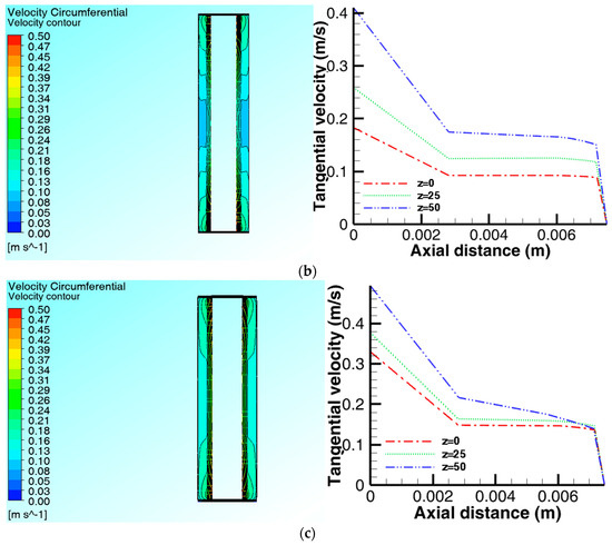 Reactor cross-sections showing the velocity contours and axial tangential velocity profiles along three horizontal lines in the X-Z plane at N = 70 rpm with the RNG model: (a) y = 0; (b) y = 0.025; (c) y = 0.045.