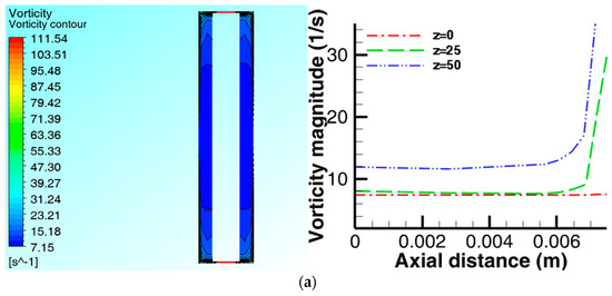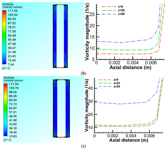 The tangential velocity Uφ contours and profiles, and the vorticity amplitude ζ contours and profiles on the X-Z plane are shown in Figure 7a–c and Figure 8a–c respectively. The axial tangential velocity distribution shows a pattern consistent with a Batchelor flow profile, except on plane y = 0 near the shaft where the velocity is zero as expected. Figure 7a–c shows a varying pattern of Batchelor velocity profiles, but with distinct separated boundary layers and a central rotating core. By contrast, the width of the rotor boundary layer is slightly longer and the rotating core slightly shorter when compared to the Batchelor profile (Figure 10b). In terms of the axial vorticity amplitude, all the profiles seem to be identical, except on plane y = 0 at the region close to the shaft where the vorticity amplitude remains constant throughout the plane (Figure 8a). Overall, the velocity and the vorticity amplitude increases with the axial plane height with the plane y = 45 recording the highest magnitude. However, there is a region of high vorticity mostly on the outer edge of the rotating disc close to the reactor wall. This observation is quite interesting as it suggests that the clearance between the disc and the reactor wall might strongly influence the vorticity magnitude. The influence of the gap ratio G on the fluid flow cannot be ruled out, and a detailed geometry parametric investigation prior to the scale-up of the reactor in future can yield some useful data for design optimization.