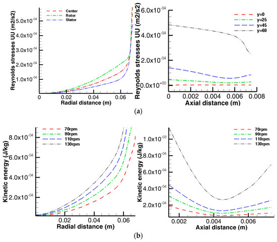 The transport phenomena in any engineered system is often controlled by the fluid properties. In the case of a stirred tank, the turbulence kinetic energy, intensity, or mixing rate of the fluid is the controlling factor [41]. Therefore, in the design of flocculation reactors, it is desirable to have uniform mixing intensities in the agitation vessel. A quantification of spatial turbulence distribution and mixing efficiency is often carried out on the basis of parameters, such as turbulent kinetic energy per unit mass and Reynolds stresses, with the Reynolds stress defined as the time-averaged product of the velocity signal fluctuations in the fluid flow, while the turbulent kinetic energy is the mean kinetic energy per unit mass associated with the turbulent eddies or flow vortex [1,16]. It has been suggested that there is a strong correlation between the stirring behavior in a mixing tank and the turbulence amplitude [16,23]. Flow turbulence within the reactor was investigated at different radial and axial planes to evaluate the mixing efficiency in the reactor. The spatial distribution of the mixing intensities within the reactor expressed as a function of the normal time-averaged Reynolds stresses is shown quantitatively in Figure 9a, while Figure 9b represents the turbulent kinetic energy per unit mass k in terms of the operating speeds at some specific locations in the fluid domain.