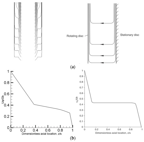 Flow streamlines for a cross sections of the reactor wheelspace and normalized axial tangential velocity profiles on X-Z plane at N = 70 rpm: (a) cross sections of the CFD and Batchelor models; (b) tangential velocity profile of the CFD and Batchelor models at y = 0.068 [8].