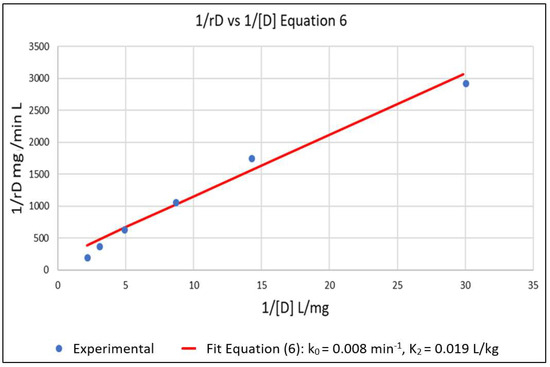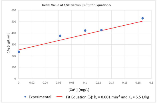 Setting [Cu2+] = 0 in Equation (5) gives Equation (6) which is linear in 1/rD versus 1/[D]. This allowed for the estimation of k0 and K2 from the slope and intercept of the plot. k0 = 0.008 min−1 and K2 = 0.019 L/mg.