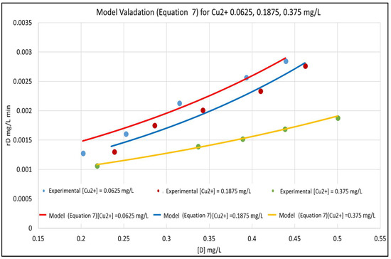 The above parameters, that were determined from the experimental data in order to parameterize the model, were k0, K2, k7 and K6. Equation (6) represents a linear relationship between the inverse of the initial reaction rate (1/rD0) and the inverse of the dye concentration (1/[D]) with slope 1/k0 and intercept K2/k0 for the case where [Cu2+] = 0. A series of experimental runs were then conducted with [Cu2+] = 0 and for various initial values of [D] ranging from 0.1 to 0.5 mg/L. The initial reaction rates for these runs was fit to Equation (6), as shown in Figure 1. The slope and intercept of the plot gave k0 = 0.008 min−1 and K2 = 0.019 L/mg. A series of runs was then conducted with the initial concentration of the dye [D] at 0.5 mg/L and for [Cu2+] ranging from 0.0625 to 0.5 mg/L. Using the values of k0 and K2 obtained from Equation (6), the data was regressed non-linearly to fit Equation (5) as shown in Figure 2. The resulting values K6 = 5.5 L/mg and k7 = 0.0001 min−1 respectively.