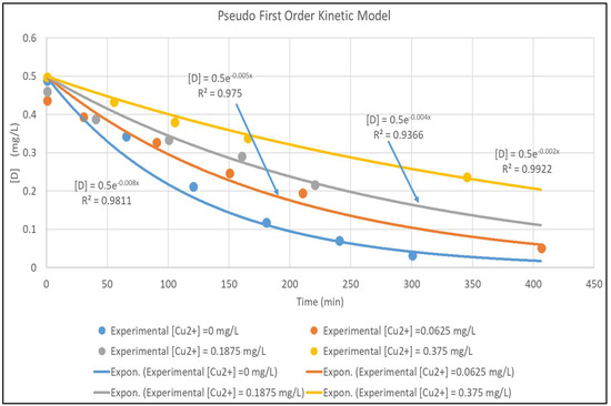 The model is validated by fitting it to the experimental data in Figure 3. The concentration versus time plots for [Cu2+] ranging from 0–0.375 mg/L are shown in Figure 4. The experimental concentration data are accurately fitted by the pseudo-first-order reaction kinetics constants, ranging from 0.002–0.008 min−1; the three parameter LH model (Equation (3)) would give an even more accurate representation of the data. Furthermore, Equation (7) is very similar to the LH result in Equation (3), rewritten here in terms of [D] and [Cu2+] and using the nomenclature of Equation (7) as: