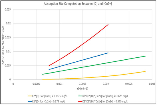 It is obvious, due to the magnitude of K6, that the (K6 [Cu2+]) term is controlling for adsorption of [Cu2+], but that the controlling factors for [D] adsorption are more complex. Figure 5 shows the magnitude of the (K2 [D]) and (K2 (K6 [D][Cu2+]) terms as a function of rD for [Cu2+] of 0.0625 and 0.375 mg/L. The Figure shows that for the more dilute [Cu2+], the interaction term is practically negligible and that the K2 [D] term is predominant. At the higher [Cu2+], the (K2 (K6 [D][Cu2+]) term that is not modeled is dominant.