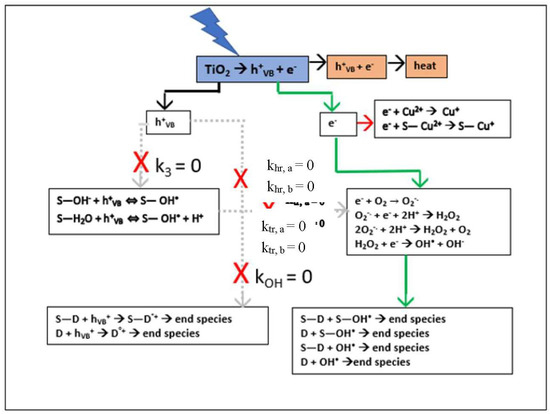 which that is first order in [D] and limited by [D] and [Cu2+] TiO2 surface adsorption. The resulting electron pathway for RB degradation shown by the green arrows in Scheme 1 is an exact mechanism for the limiting conditions and assumptions.