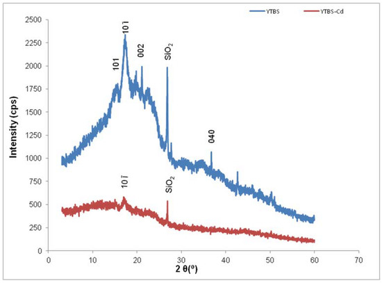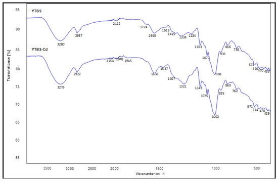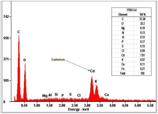 A thermogravimetric analyzer (TGA Q5000-TA instrument, New Castle, DE, USA) determined the gravimetric change with temperature of the YTBS residue adsorbent and the procedure was based on the approach reported in Asuquo and Martin [30]. The density of the YTBS adsorbent was determined using helium pycnometry since helium is a very small particle with an atomic diameter of 1.7 Å. The instrument used for the analysis of the residues was the Accu Pyc 11 1340 Helium pycnometer (Micromeritics) and the procedure was based on the approach reported in Asuquo and Martin [30].The point of zero charge (pHpzc) of the YTBS adsorbent was determined using the Malvern Zetasizer. The equipment used was a Zetasizer 3000 HSA (Malvern Instruments, Malvern, UK) and the procedure was based on the approach reported in Asuquo et al. [31]. The samples were prepared using 0.1 g of sample into 20 mL of 0.01 M NaCl solution at pH range of 2–12 and agitating it in a shaker at 300 rpm for 24 h. An attenuated total reflectance fourier transform infrared spectroscopy (ATR-FT-IR) in transmittance mode with spectral resolution of 4 cm−1, background subtraction and spectral range of from 4000–400 cm−1 based on average of 32 co-added scans was used to characterize the functional groups on the YTBS adsorbent before and after Cd(II) ion sorption. The instrument used was a Smart Golden Gate Thermo Nicolet Avatar 360 FT-IR with ATR probe [30].