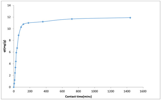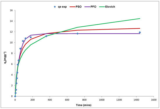 Thus, Equation (10) will be used to model the non-linear PSO kinetics for the sorption reported in this work and assumes a stronger interaction between the adsorbate and adsorbent based on the chemisorption of the adsorbates onto the adsorbents in the system under consideration. One advantage of using the PSO equation for the modelling of adsorption kinetics is that there is no need to know the equilibrium capacity from the experiments, as this value, the PSO rate constant and the initial adsorption rate can be calculated from the model [30,31,50].