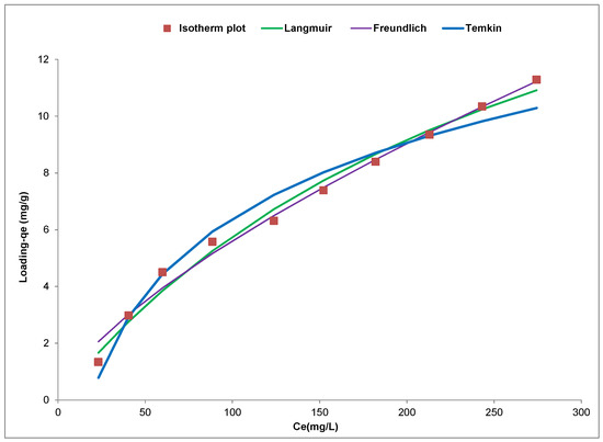 The Temkin isotherm model contains a factor that explicitly takes into account the adsorbent–adsorbate interactions. It is based on the assumption that the heat of adsorption of all the molecules in the layer would decrease linearly with coverage due to adsorbent–adsorbate interactions [37,38]. The adsorption is characterized by a uniform distribution of binding energies, up to some maximum binding energy. The Temkin adsorption isotherm in its non-linear form in Equation (4) as reported by Temkin and Pyzhev [37,39].