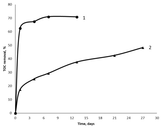 Figure 2. The removal of TOC in the laboratory facility operated in batch mode with either fresh iron ore (curve 1) or used iron ore (curve 2).
