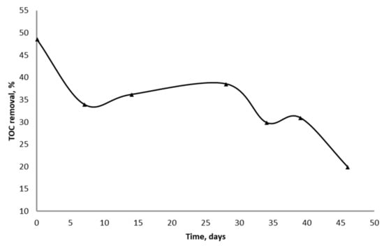 A role in TOC removal plays adsorption of organic compounds on initial iron ore. In abiotic control, decrease of TOC after 2 h of contact between wastewater and iron ore was in the range 17–21%. The batch process was performed in triplicates with very similar results, which are not shown to avoid oversizing. The duration of the batch process depends on the growth of iron-reducing bacteria biomass in batch culture, which is a slow process typically continuing over 15–21 days [6,8,12,16], while an adsorption of organic substances on produced ferrous hydroxide(s) could take just a few hours.