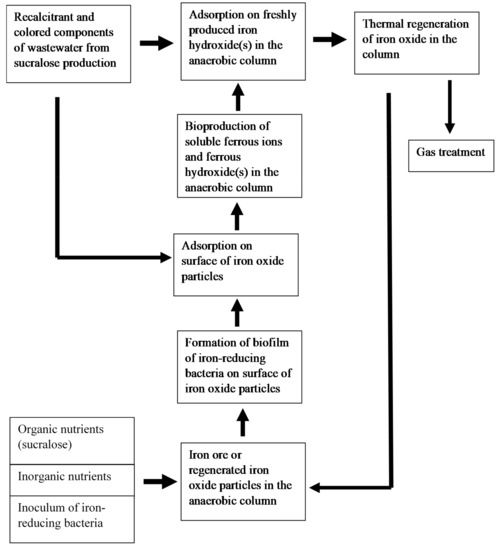The conceptual scheme for the removal of xenobiotics from the wastewater of sucralose production plant using regenerated iron oxide adsorbent is shown in Figure 4.