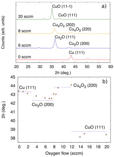 Thus, monitoring the diffraction peaks in the 38° < 2θ < 45° region as a function of the Cu film oxidation (i.e., oxygen partial pressure, in the synthesis), the Cu2O stoichiometry can therefore be associated with a minimum of reflection angle due the <200> reflection. Similarly, an abrupt decrease of the diffraction angle is expected as the <220> reflection due to the Cu4O3 phase, transforms into the fully oxidized CuO phase. Following this reasoning, Figure 1b shows the position of the diffraction peak (38° < 2θ < 45°) as a function of oxygen flux. Thus, at flow rates between 1 to 6 sccm films are composed of a Cu2O phase, rich in defects as evidenced by the smaller interplanar spacing (corresponding to the <200> reflection) compared to stoichiometric Cu2O (Figure 1). We attribute this smaller interplanar distance to either oxygen vacancies or Cu metal additions in the lattice. At around 6 sccm, the Cu2O phase is formed, and is associated with a local minimum in 2θ. Higher oxygen fluxes, between 6 and 12 sccm, lead again to the increase of the angle of the diffraction peak between 38° < 2θ < 45°, and correspond to CuO1−x stoichiometry, with x < 1, notably we expect that Cu4O3 is formed in this region [25,26]. The abrupt decrease of angle of the diffraction peak observed at high oxygen fluxes (>12 sccm) shows that films with CuO stoichiometry are formed under these sputtering conditions. A similar variation of the diffraction peak angles for the different Cu oxide phases between 38° < 2θ < 45° has also been reported by Meyer et al. [26].