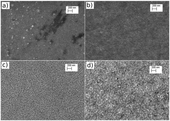 SEM micrographs are presented in Figure 3 for films deposited at oxygen flow rate of 2 sccm [panel (a)], 6 sccm [panel (b)], and 20 sccm [panel (c)]. Figure 3 shows how the increase in oxygen flow rate results in growth of a nanoporous layer which we attribute to a columnar growth of copper oxide [18]. The protrusion visible in SEM are slightly larger than the grain sizes deduced from XRD, and are thus composed of polycrystalline grains. By using Scherrer’s formula and the XRD data presented in Figure 1a, the mean grain size of the films was estimated to be 5.36, 9.74 and 12.95 nm, respectively, for samples shown in Figure 3a–c, (calculated from highest intensity peak in the XRD pattern and assuming a shape factor of 0.9 in Scherrer’s equation). Grain sizes corresponding to other films are presented in Table 1. The largest grain size (around 10 nm) was achieved close to stoichiometric conditions, namely Cu metallic (0 sccm), Cu2O (6.0–7.5 sccm) and CuO (20.0 sccm). As expected, intermediate conditions resulted in smaller grain sizes due to the presence of lattice defects. Regarding the effect of the annealing of the size and morphology of the films, Figure 3d corresponds to a sample deposited at 2 sccm which was subsequently annealed in air at 500 °C during 45 min. The grain sizes, calculated from the XRD data presented in Figure 2, increased from 5.36 to 9.27 and 16.10, respectively, for as-deposited films annealed to the 250 °C and 500 °C. Before annealing, the morphology of the samples deposited at 2 sccm (Figure 3a) exhibited protrusions and irregularities, which is attributed to the Cu metallic phase, since they disappear after annealing (Figure 3d), or when the oxygen flow rate is increased (Figure 3b,c).