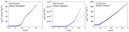 Cu2O is known to exhibit both a direct forbidden and a direct allowed transition, with the latter located approximately +0.45 eV above the direct forbidden transition [24]. According to Figure 1b films deposited at 6 sccm are likely to present Cu2O stoichiometry. In Figure 4a,b show plots of (αE)2/3 and (αE)2 vs. E. It is seen that films deposited at 6 sccm O2 flow are well described by an absorption edge characterized by a direct forbidden transition at 2.06 eV followed by a direct allowed transition at 2.55 eV, in excellent agreement with previous reports for Cu2O [24]. Regarding CuO, it is not well stablished in the literature whether CuO presents a direct or indirect transition [24]. In our case, the CuO samples obtained at 20 sccm exhibit a clear indirect allowed transition located at 1.28 eV, Figure 4c, which is in good agreement with the value of 1.24 eV reported by Wang et al. [24] for CuO.