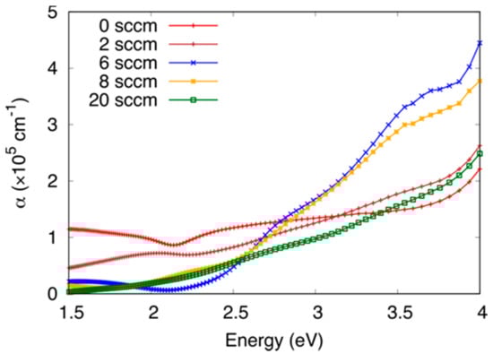 Absorption coefficient, α, plotted vs. the energy of the incident photon for different samples deposited at different oxygen fluxes.