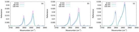 In-situ FTIR reflection spectra (baseline corrected) acquired after 0, 60 and 120 min of irradiation time; the spectra correspond to samples deposited at different oxygen fluxes: 2 sccm (a), 12 sccm (b) and 20 sccm (c) coated with StA. The figure show the asymmetric νas(CH), and symmetric, νs(CH), stretching modes of the CH2 group present in StA.