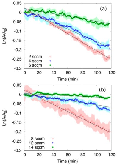 where A0 is the initial integrated peak area (t = 0) and at time t respectively and k is photodegradation rate. Figure 7 shows ln(A/A0) vs. t for samples deposited at low/medium oxygen flow rates (2, 4 and 6 sccm) [panel (a)] and medium high (8, 12 and 14 sccm) [panel (b)]. Results depicted in Figure 7 have been obtained by the average over 5 measurements. The shadow of each curve signifies the error, calculated as the average ± the standard deviation for each point. Irrespective of the oxygen flow rate used during deposition, the curves presented in Figure 7 follow a linear trend throughout the irradiation time. The photodegradation rate, k, was obtained as the value of the slope of the linear fit (solid black lines presented in Figure 7) for each case. Figure 8 shows the initial photodegradation rate, , calculated for films deposited at different oxygen flow rates; is defined as the derivative of Equation (2) evaluated at t = 0, i.e.,