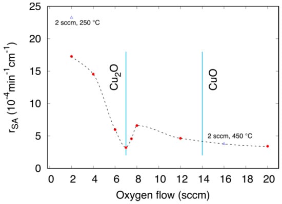 Stearic acid photodegradation rate at t = 0, , for samples deposited at oxygen flow rates ranging from 2 to 20 sccm (solid red circles) using Equation (3). Corresponding data for films prepared at 2 sccm post-annealed at 250 °C (exhibiting Cu2O structure) and 450 °C (exhibiting CuO structure) are shown for comparison (blue open triangles).