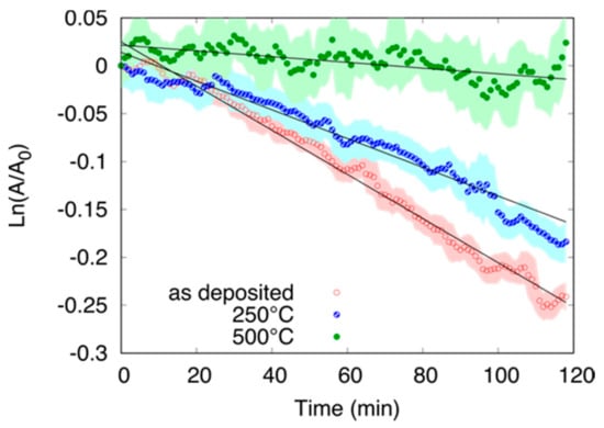 Figure 9 shows ln(A/A0) vs. time plotted for samples deposited at 2 sccm oxygen flow rate, as deposited and annealed in air at 250 °C and 500 °C during 45 min. X-ray diffraction patterns corresponding to these samples were presented in Figure 2. As in the case of Figure 7, the data presented in Figure 9 have been obtained by a 5-point average, where the shadow of each curve signifies the error, calculated as the average ± the standard deviation for each point. Similarly, k was obtained as the absolute value of the slope of the linear fit (solid black lines presented in Figure 9) for each case. For the as-deposited sample (consisting on a mix between Cu and Cu2O phases), k = 2.30 × 10−3 min−1. As expected, k decreases slightly after 250 °C annealing, when the film approaches Cu2O stoichiometry (k = 1.50 × 10−3 min−1), dropping abruptly after 500 °C annealing (k = 0.30 × 10−3 min−1) approach the same degradation rate as the CuO films prepared at high O2 flow (see Table 2). The rate constants and quantum yield for the post-annealed films are shown in Figure 8 and Table 2. We see that the post-annealed films show the same behavior as the sputtered films with the Cu-Cu2O film exhibiting the highest rate. The rate and quantum yield for the post-annealed Cu-Cu2O heterojunction film are the highest of all measured films, and is attributed to the well-developed Cu and Cu2O phases and grain boundaries formed upon annealing [16].