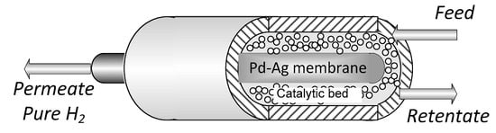 Membrane reactors (MRs) are a promising solution to overcome these limitations, combining the reaction and H2 separation by means of a selective membrane. The presence of a hydrogen-selective membrane allows the removal of hydrogen from reaction side with a contemporary recovery a hydrogen rich/pure stream [21] and the shifting of the reaction toward further conversion. In addition, as the permeation is a pressure driven process, the negative effect of reaction pressure, which favors RWGS, is counterbalanced by the promotion of hydrogen removal from reaction volume. In addition, MR operates below 600 °C, thus, below the temperature range at which coke deposition readily occurs [22]. In most cases, the MRs used for DRM are constituted by a selective membrane—usually Pd-based—having only the separating function, whereas the catalyst is packed in the annulus between the membrane and reactor shell [23,24,25,26,27,28,29].